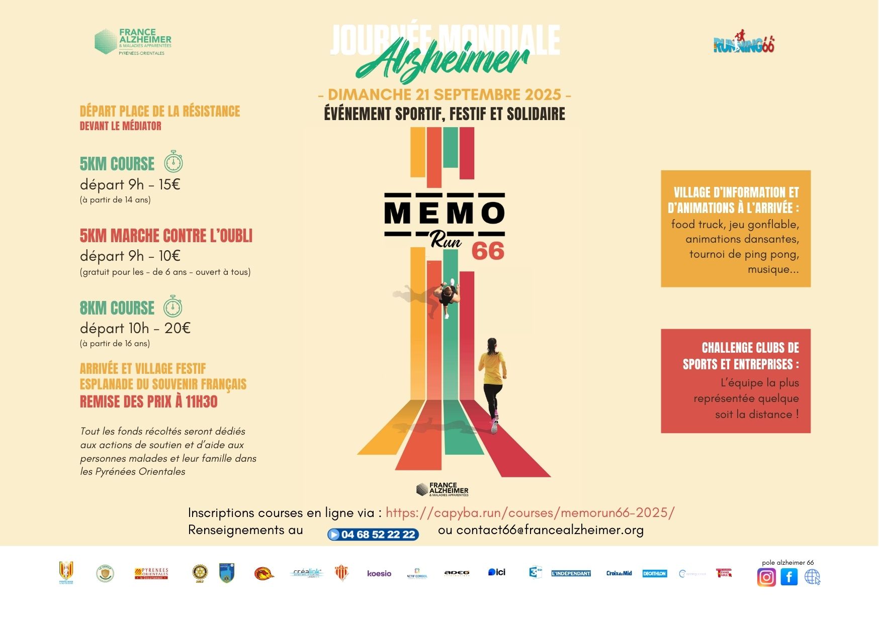 Cette année, l’association France Alzheimer des Pyrènées-orientales, en partenariat avec Running 66 organise une déclinaison locale de cet évènement sportif et solidaire en proposant la Memo Run 66 dont le départ sera donné depuis la place de la Résistance (face au Médiator), au centre de Perpignan.
